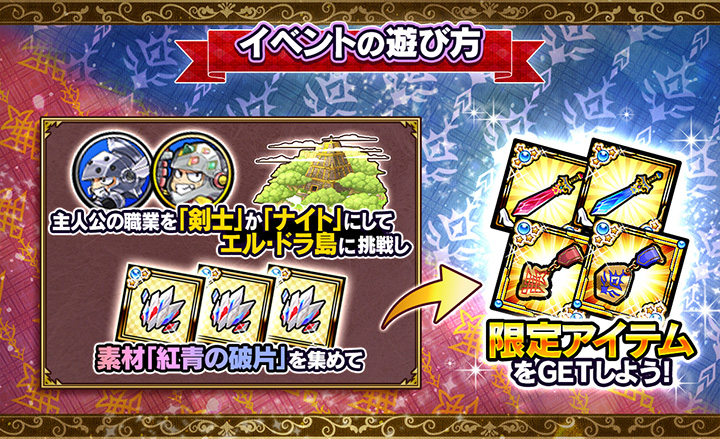 イベント期間中、主人公の職業を「剣士」もしくは「ナイト」にした状態でエル・ドラ島の「黄金フロア」「経験値・強化石フロア」に挑戦すると素材「紅青の破片」がドロップするよ!