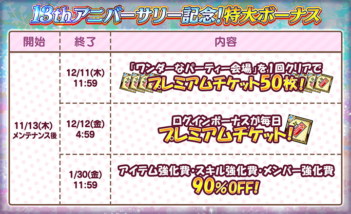 「13thアニバーサリーチャレンジ」では、時間の経過で様々な報酬が手に入るよ!